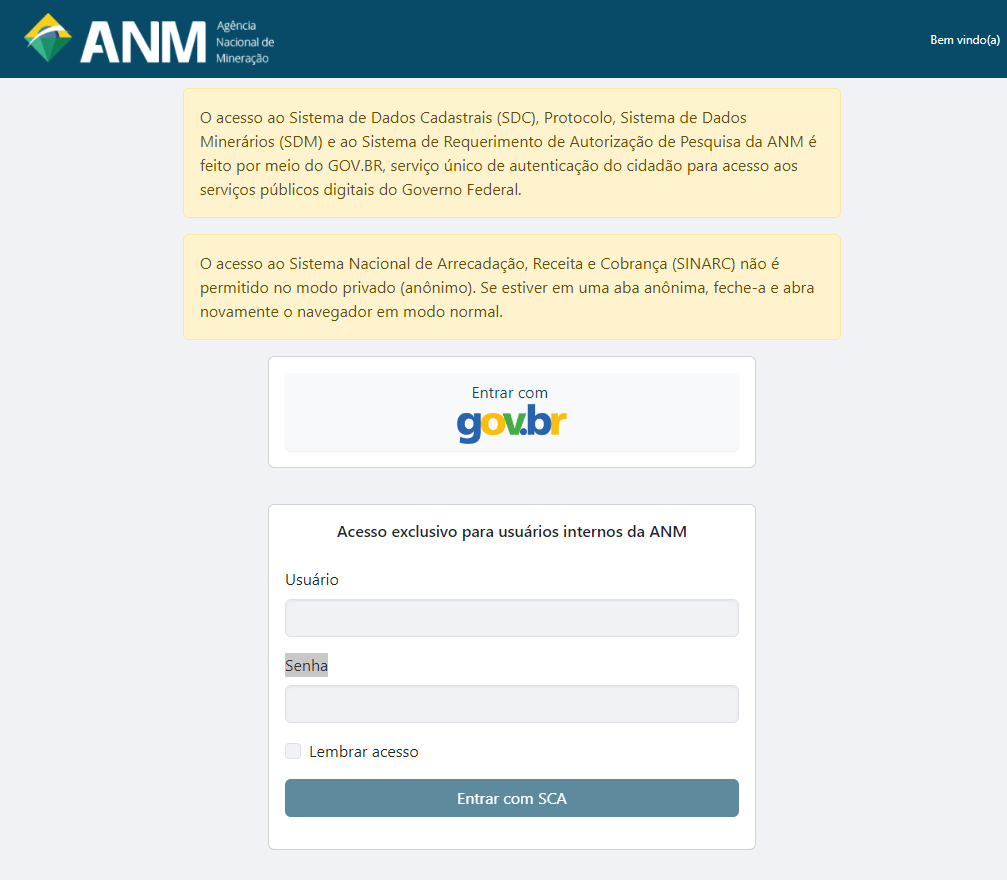 Ou, caso seja um usuário interno da ANM, você poderá realizar a autenticação com o usuário e senha do SCA