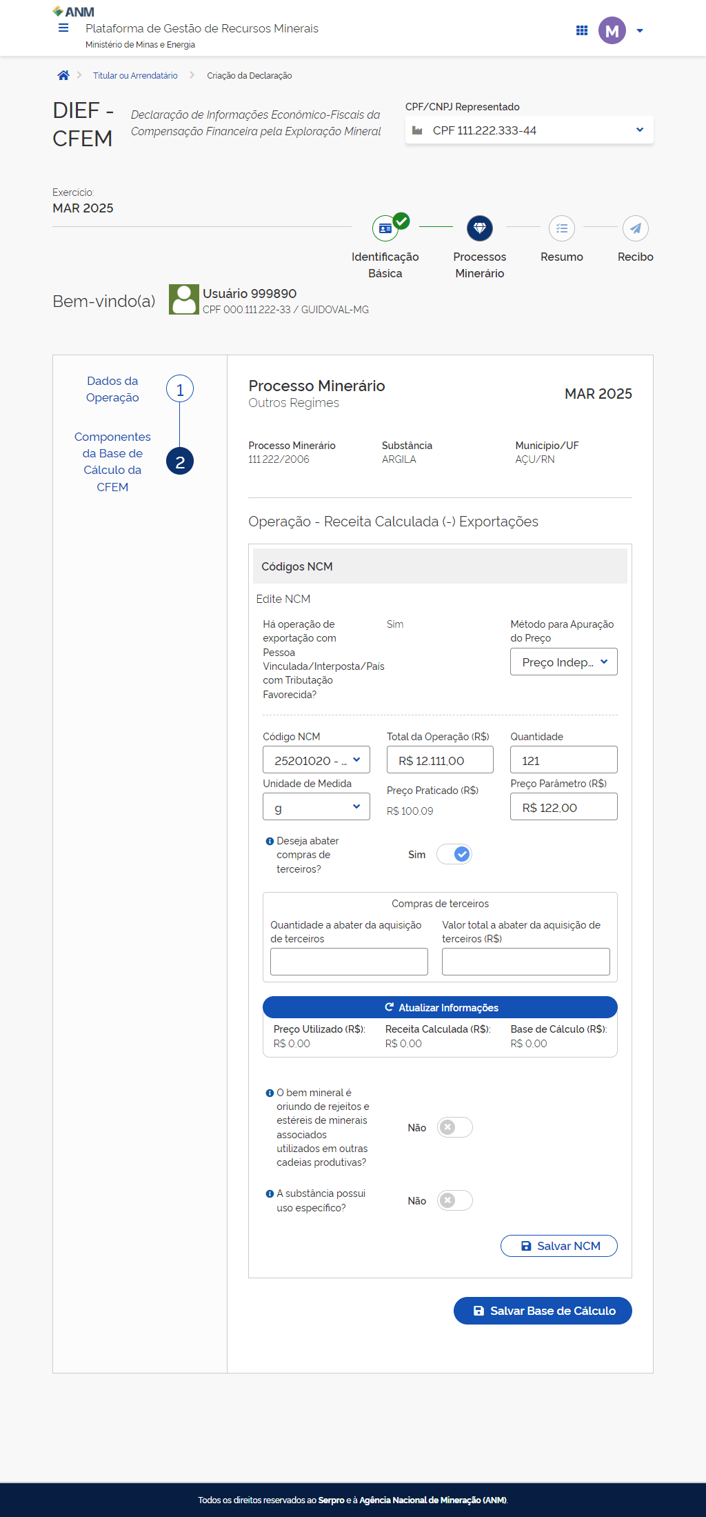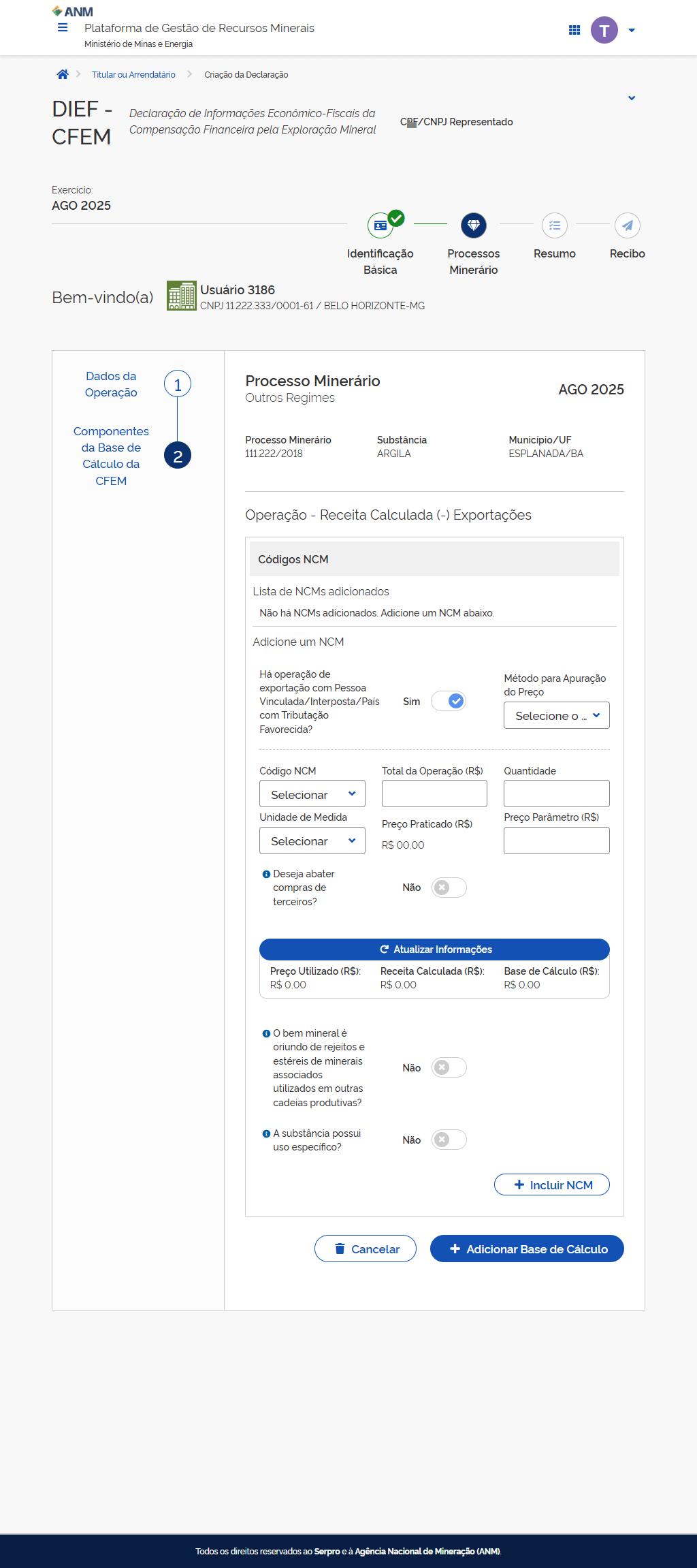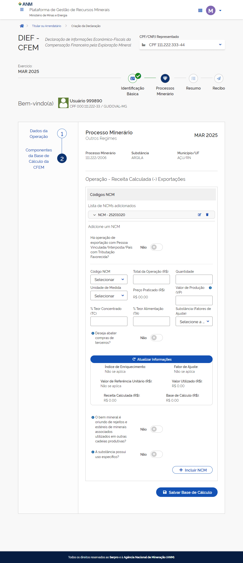 Preencha as informações do Código NCM do bem mineral.