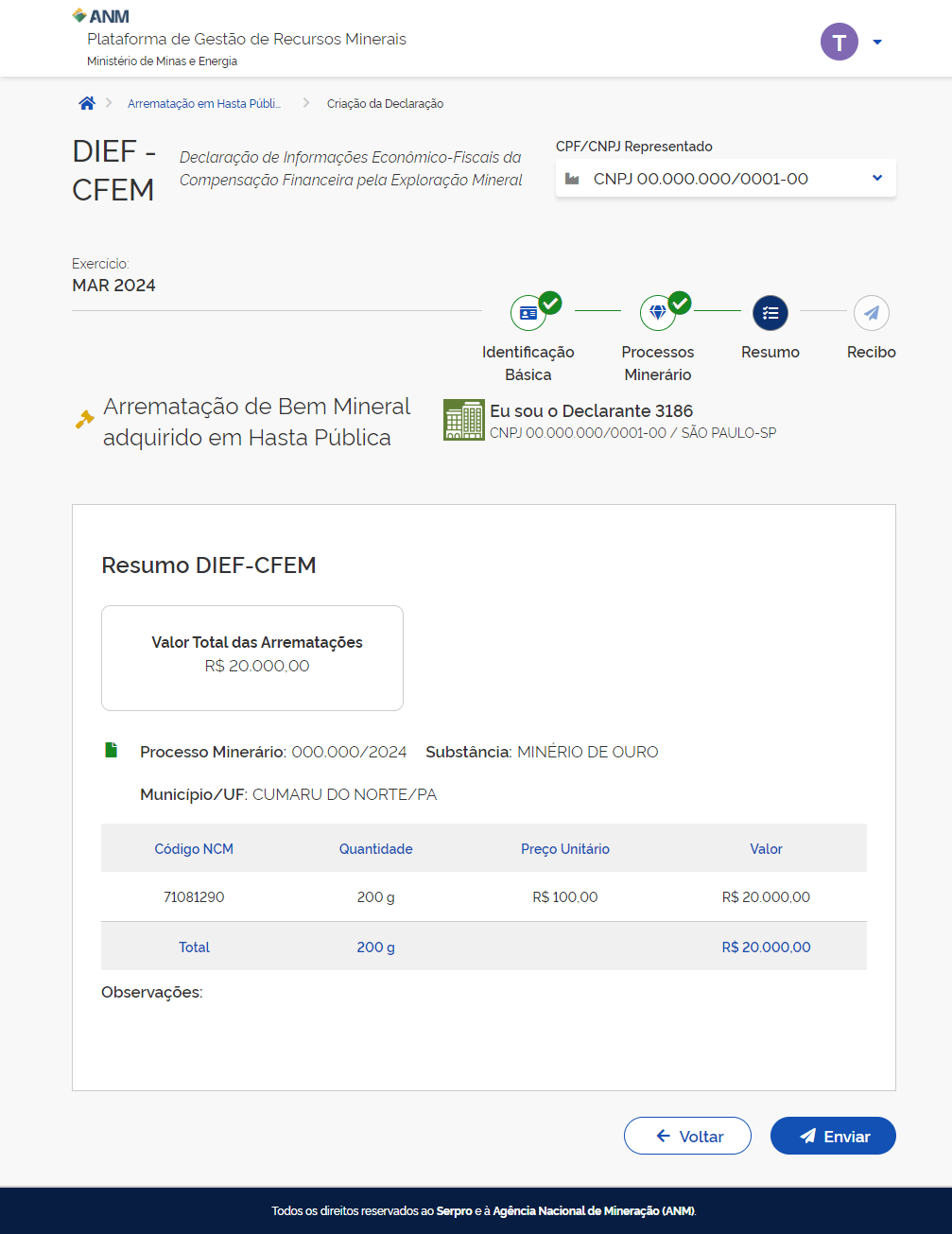 Poderá visualizar os dados preenchidos na declaração na sessão Resumo DIEF-CFEM.